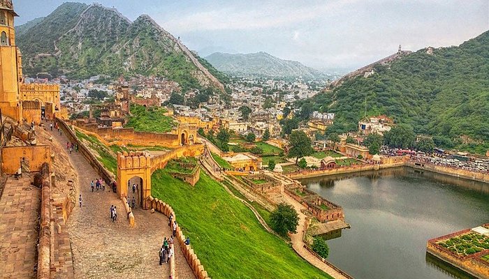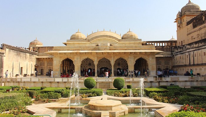 Amber (Amer), about 11 km from Jaipur, is a UNESCO World Heritage Site and the former stronghold of the Kachwahas of Amber. Built between 1592 and the early 17th century, it blends Hindu and Mughal architectural styles. Made of red sandstone and white marble, the palace features intricate carvings, precious stones, and mirrors. Its stunning interior contrasts with the rugged exterior, overlooking the scenic Maota Lake. Originally a small fort captured from the Meena tribes, it evolved into the grand Amber Palace known today.